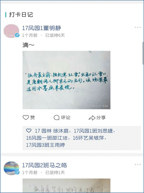 本次比赛创新采用手机自媒体,利用微信平台操作简便受众广泛,统计科学的优势,使用“小打卡”这一小程序,每天向参与打卡同学推送三个专业相关知识点或诗文美句、歌词赏析、传统文化剖析等内容,以抄写、拍照上传、语音反馈形式提高员工的参与积极性,在整个小打卡推送过程中,公司组建了一支以员工线老师为主、员工干部为辅的小打卡管理团队,保证小打卡工作的正常开展,自3月底到5月底为期两个月(休息日无推送),在这期间,共给打卡人数213人,打卡总记录数为987次,其中打卡时间最长员工坚持打卡57天,对员工养成良好的学习习惯有推动作用。本次小打卡活动共计颁发博文奖、智明奖、敏达奖、睿思奖、持之以恒奖共计16人次,均颁发证书及奖金。